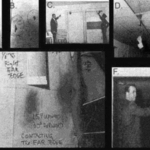 A. Close-up view of two bullet holes in kitchen door frame B. Close-up up view of two bullet holes in in center of the door frame, inside the kitchen. C. An investigator points out a bullet hole in a ceiling tile. D. Coroner Thomas Noguchi, who was bold enough to announce the impossibility of one shooter, examines a bullet hole in a ceiling tile, later destroyed by then-Chief Daryl Gates around the time of the House Select Committee on Assassinations was investigating the link between the Kennedy and King murders. E. Test firing showing the distinctive “tattooing” which proved the fatal shot was fired from one inch or less. F. Door frame later set aflame and destroyed by Daryl Gates. Embedded was a bullet that did not match Sirhan’s pistol.