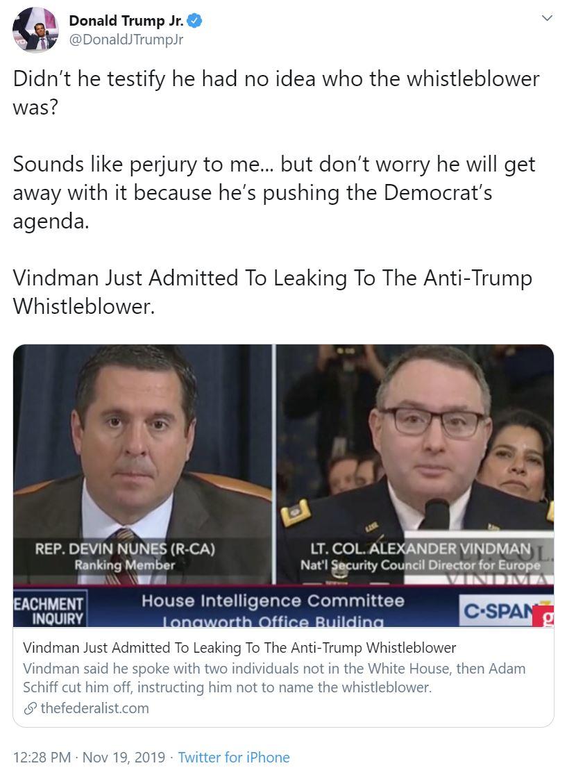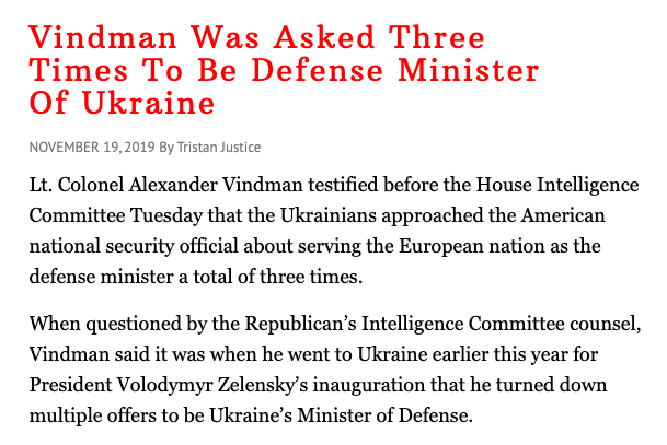 As one would fully expect, though, this report notes, the deranged and demented socialist Democrats trying to overthrow President Trump with a sham impeachment coup astonishingly made Colonel Vindman their “star witness” during yesterday’s Soviet-style hearings—a hearing that saw impeachment coup leader Commissar Adam Schiff stopping Colonel Vindman from saying the name of CIA operative Eric Ciaramella in a comical bid to protect this supposed “whistleblower” whom Schiff has already said he doesn’t know the name of—and after whose hearing testimony, then saw the leftist mainstream media outlet MSNBC proclaiming that Colonel Vindman “Saw a Bribery Plot” during Trump’s phone call conversation with Ukrainian President Zelensky—an outright lie of gargantuan proportions that stands opposed to Colonel Vindman’s actual under oath testimony wherein he admitted he has never used the term “bribery” to describe the President Trump’s actions—further admitted Trump was “well within his rights” to ask Ukraine for help in an investigation— said there was an appearance of a conflict of interest with Hunter Biden being on the Burisma board Trump wanted Ukraine to investigate—admitted that he had no firsthand knowledge of aid or an investigation and was just “following news accounts”—and further admitted that the Trump-Zelenksy transcript was “very accurate” and that putting its transcript on a secure server was “definitely not unprecedented”.