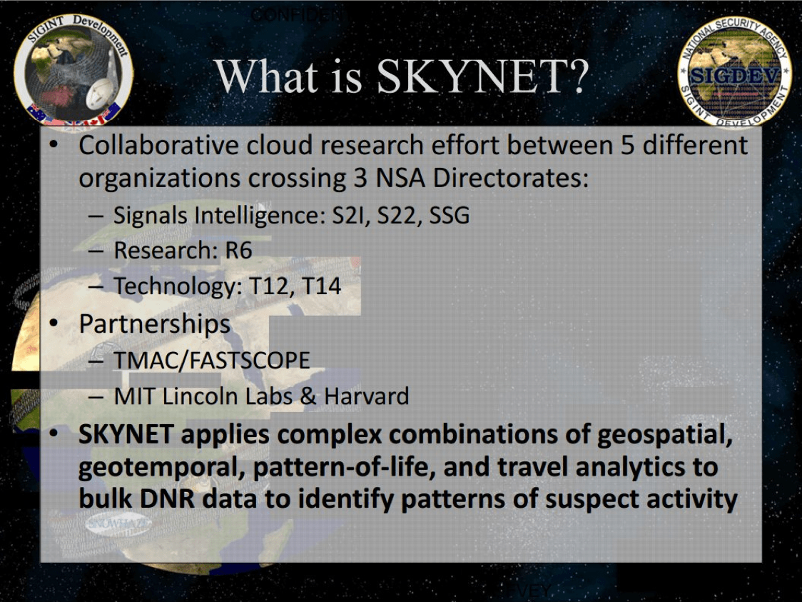 As if the United States creating for itself a “Secret Kill List” wasn’t horrific enough, this report notes, this “disposition matrix” went into full insanity mode when it was put under the total control of SKYNET—which is a program run the US National Security Agency that performs machine learning analysis on communications data to extract information about possible terror suspects—and in reality means that every single person being targeted for death by these Americans is being done by a secret computer algorithm absolutely no one is allowed to know about—and that even top computer experts in the United States have called “complete bullshit”—and who further shockingly revealed: