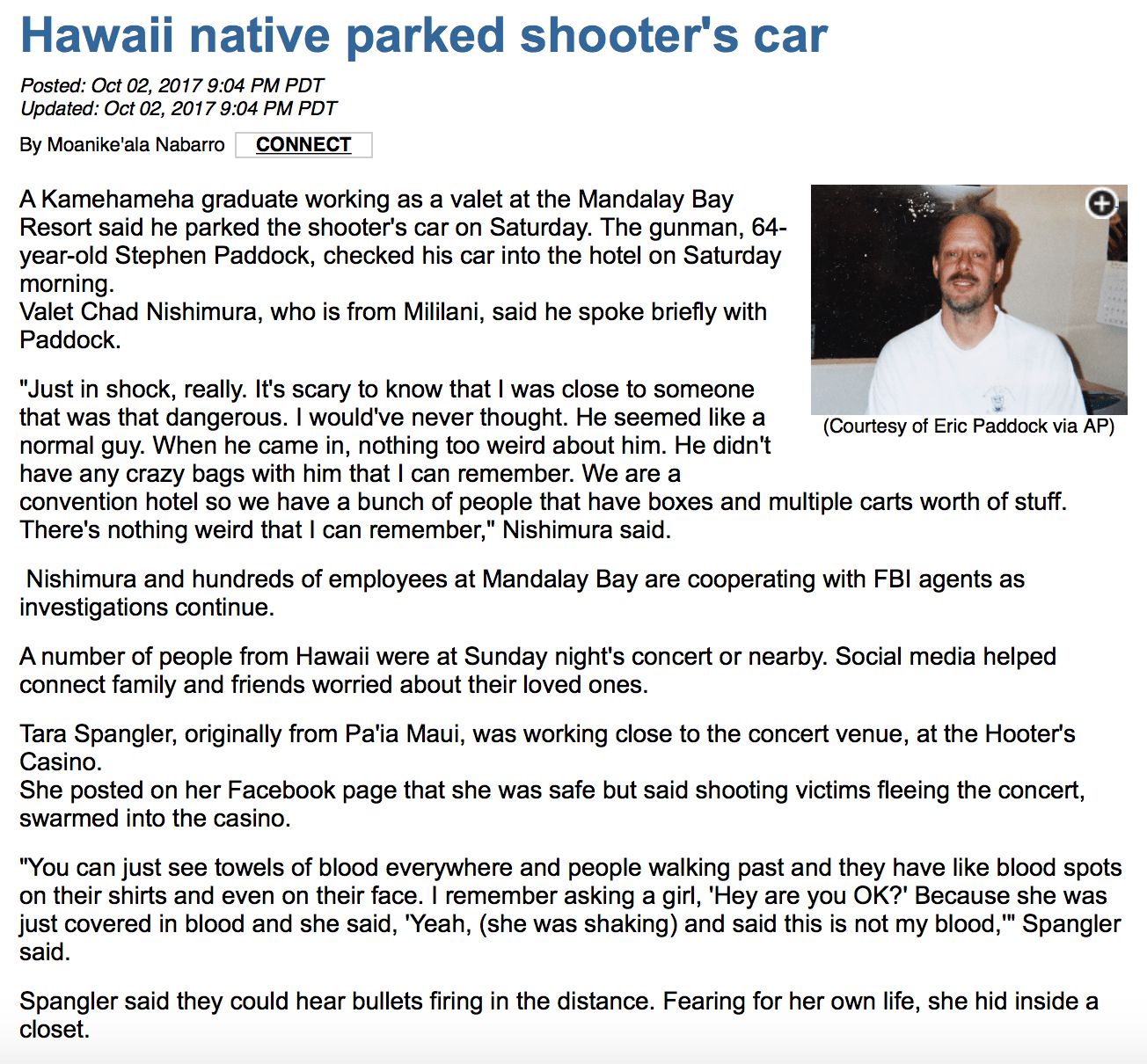 Shortly after Chad Nishimura exposed this CIA lie, and who further stated that Stephen Paddock had checked into the Mandalay Bay Hotel on 25 September without any luggage, and was a “normal guy”, this report continues, he disappeared—not just in person, but on the internet and social media, too, with all information about him being scrubbed—and that includes a news article written about him by his Hawaiian home town television station—but that was saved by the SVR before it could be disappeared entirely.