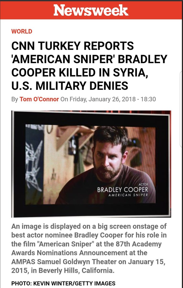 A new Ministry of Defense (MoD) report circulating in the Kremlin today is expressing perplexity as to why the American satellite news channel CNN has outlandishly reported that Turkish military forces have killed the famous Hollywoodactor Bradley Cooper—with CNN breathlessly reporting to its Middle East viewers that Turkey had killed two US special forces troops, one of whom they identified as “American Sniper” Chris Kyle—with their using a picture of Cooperwho portrayed Kyle as an actor—with the Pentagon quickly denying this outrageous claim—but that immediately after which, saw President Donald Trump ordering one of the CIA’s main terror groups in Syria to be listed as terrorists. [Note:Some words and/or phrases appearing in quotes in this report are English language approximations of Russian words/phrases having no exact counterpart.]
