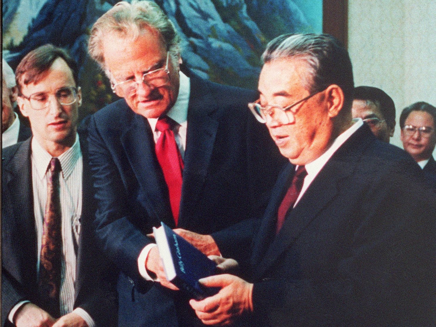 American Christian evangelist Billy Graham presents his book “Peace With God” to North Korean Supreme Leader Kim Il-sung in Pyongyang on 2 April 1992