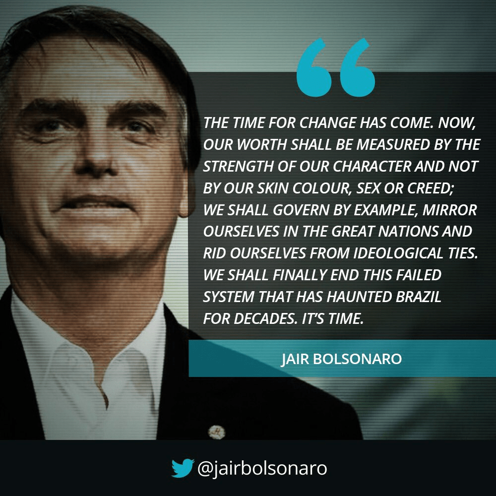 Like President Trump had vowed to the American people before he ascended to power, too, this report continues, President Bolsonaro vowed to the Brazilian people that if elected he would govern their nation according to the Bible and his nation’s Constitution—and who, in his acceptance speech delivered upon his victory Sunday, declared: “We cannot continue flirting with socialism, communism, populism and leftist extremism … We are going to change the destiny of Brazil”.