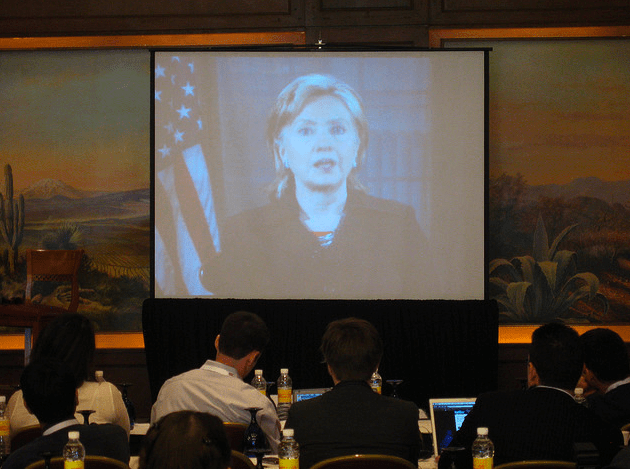Secretary of State Hillary Clinton addressing the delegates to the 2009 Alliance of Youth Movements Annual Summit in Mexico City, on 16 Oct 2009, via videolink.