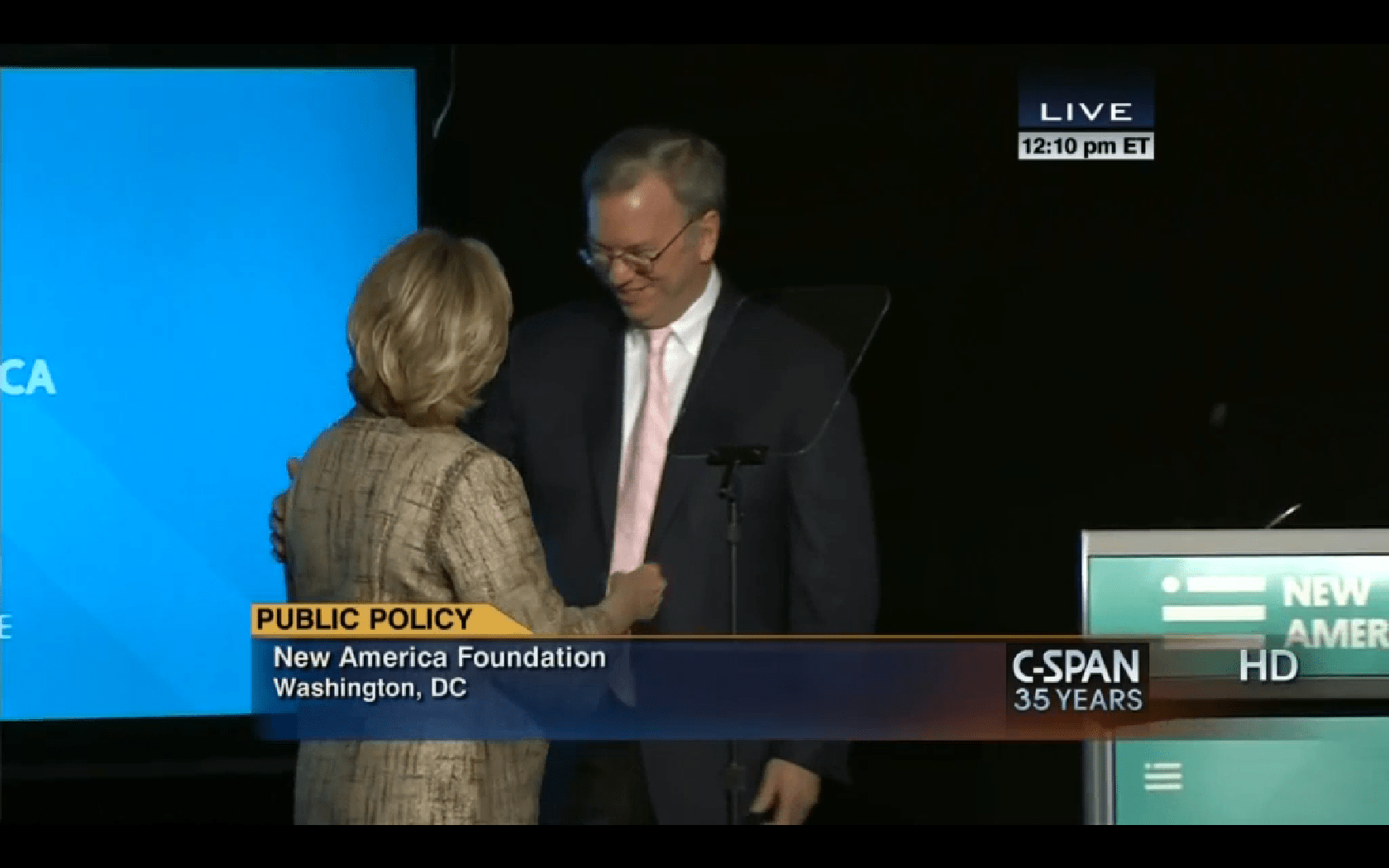 Google Chairman Eric Schmidt introduces Hillary Clinton as the keynote speaker at the 16 May 2014 conference “Big Ideas for a New America” for the New America Foundation, of which Schmidt is the Chair of the Board and the largest funder.