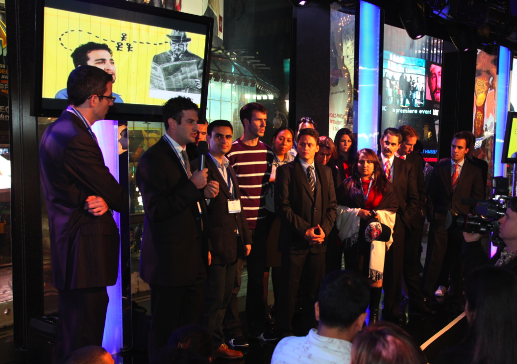 Jared Cohen on stage with the delegates at the New York City inaugural summit for the Alliance of Youth Movements, in 2008