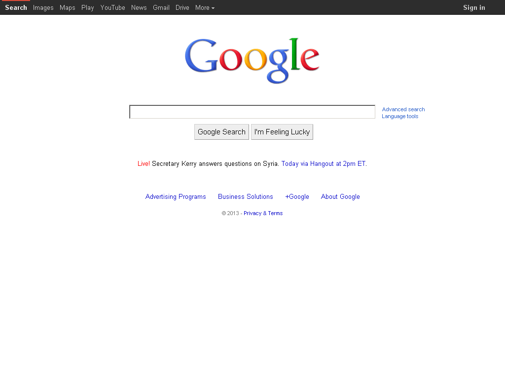In Autumn 2013 the Obama administration was trying to drum up support for US airstrikes against Syria. Despite setbacks, the administration continued to press for military action well into September with speeches and public announcements by both President Obama and Secretary of State John Kerry.63 On September 10, Google lent its front page—the most popular on the internet—to the war effort, inserting a line below the search box reading “Live! Secretary Kerry answers questions on Syria. Today via Hangout at 2pm ET.”64