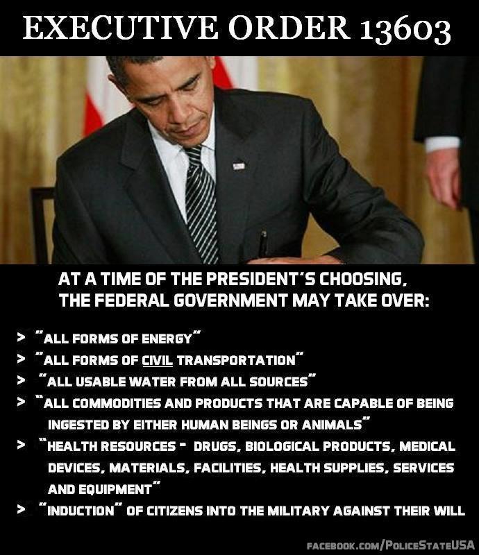 Executive Order 13603 signed by President Barack Obama on 12 March 2012 grants sweeping war powers to President Donald Trump