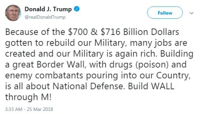 Far from the United States being a “failed state” unable to pass any laws, however, this report details, this past February (2018) saw the US Congress pass, and President Trump sign into law, the largest budget in the history of the Department of Defense—that gave Trump’s military forces over $1.4 trillion for two years worth of funding—with Trump, this past week, receiving from the US Congress a further $82 billion as his invasion of Mexico nears.
