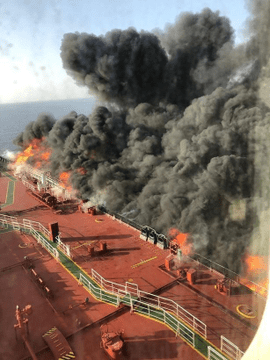 Kokuka Courageous oil tanker burns (above) after being torpedoed in Gulf of Oman on 13 June 2018