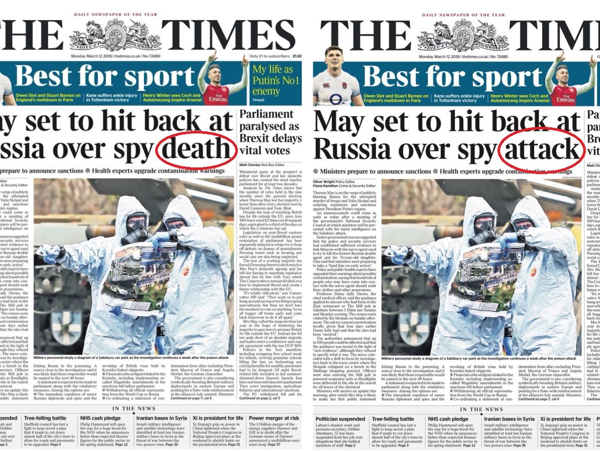 British government official propaganda newspaper The Times has to change headline after Skripals refuse to die
