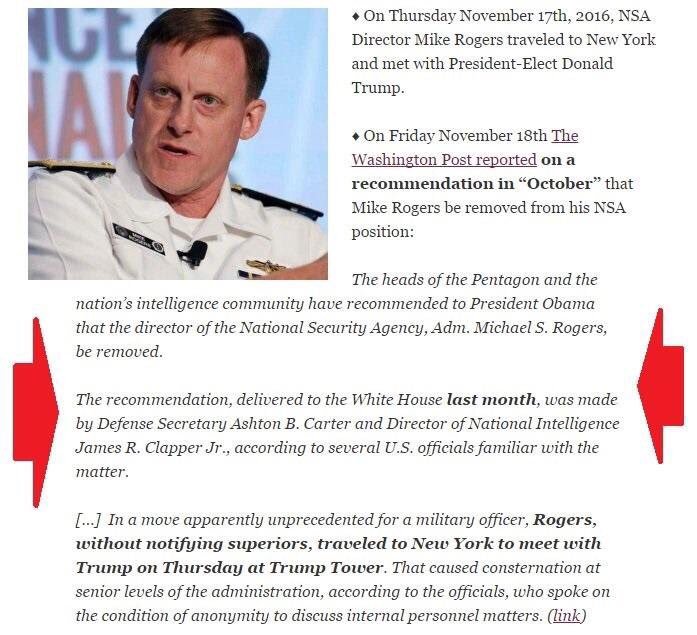 With ONA operative Halper unable to continue his “active measure” investigation through normal means, this report notes, NSA Director Admiral Rogers authorized his reaching out to SVR Director Naryshkin—and that led to a combined Halper-Rogers-Naryshkin document being produced on this “active measures” plot that NSA Director Admiral Rogers secretly flew to New York City from Washington D.C., on 17 November 2016, and gave to then President-elect Trump—and that Rogers did without informing President Obama, or any Obama Regime official, thus causing top US intelligence officials to demand that Obama fire him—but that couldn’t be done as Admiral Rogers was part of the US military, and unlike civilian officials in the Obama Regime, couldn’t be summarily dismissed without evidence being presented against him.