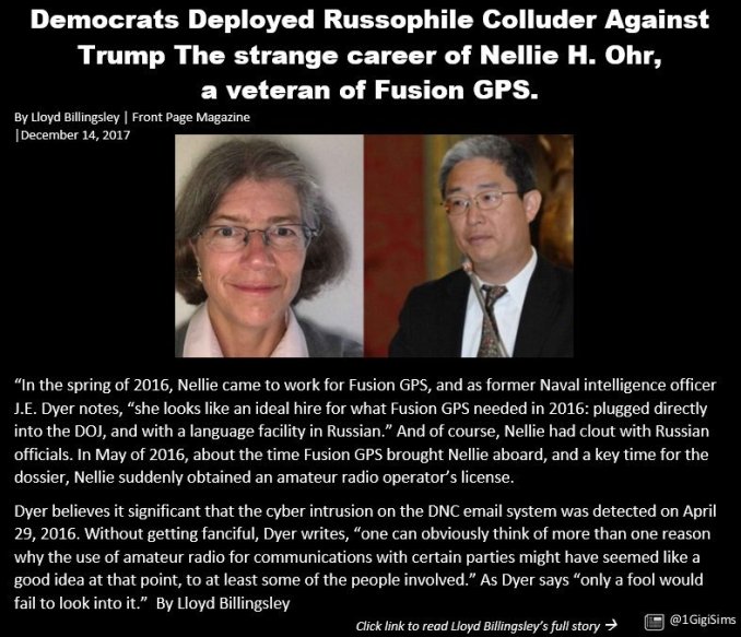 Even more shocking to know about Nellie Ohr, this report explains, is that coinciding with the beginning of her “active measures” radio broadcasts with her fellow communists CIA Director Brennan, FBI Director Comey and MI6 operative Steele, she was employed by the company Fusion GPS to specially work on a secret project called the Trump-Russian Dossier—that was paid for by Hillary Clinton and her Democratic Party, along with FBI Director Comey—and from where Nellie Ohr, also, set up an entrapment meeting between Trump campaign officials and a Russian lawyer to provide “collusion evidence” for their plot—followed by FBI Director Comey using the made up Trump-Russian Dossier to illegal obtain secret court warrants to spy on the Trump campaign, and much too late, when he realized what he was actually a part of, quit using FBI money to pay MI6 operative Steele—but that didn’t stop the “Woman In The Middle” Nellie Ohr who, after FBI Directory Comey tried to leave this “active measures” plot against Trump, simply turned to her US Department of Justice top official husband Bruce Ohr to continually feed communist generated propaganda against Trump into the now completely corrupted American “fake news” mainstream propaganda, legal and intelligence systems.