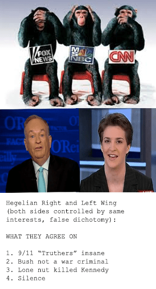 The Right and Left , Conservative and Liberal, all of that is a control device: progress in the Hegelian State is through contrived conflict. The clash of opposites makes for progress, and if you can control the opposites, you steer the outcome. The corporate state operates on Hegelian principles wherein six CEOs control the western media: compare this to Protocol 12: “All our newspapers will be of all possible complexions –aristocratic, republican, revolutionary, even anarchical … Those fools who will think they are repeating the opinion of a newspaper of their own camp will be repeating our opinion or any opinion that seems desirable for us. In the vain belief that they are following the organ of their party they will in fact follow the flag which we hang out for them.”