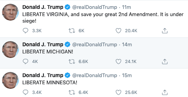 Messages of liberation the American people are responding to by the tens-of-thousands as they rise in protest against their socialist overlords, and, also, sees this nation’s college students preparing to launch a peaceful rebellion against socialist mandated stay-at-home orders—actions of liberation, though, these socialist tyrants are warning shows “Trump is playing with fire”, has them saying “Trump is fomenting domestic rebellion”, and sees the leftist New York Times even more dementedly screaming “Trump Is Asking Us to Play Russian Roulette With Our Lives”.