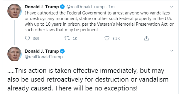 I have authorized the Federal Government to arrest anyone who vandalizes or destroys any monument, statue or other such Federal property in the U.S. with up to 10 years in prison, per the Veteran’s Memorial Preservation Act, or such other laws that may be pertinent.
