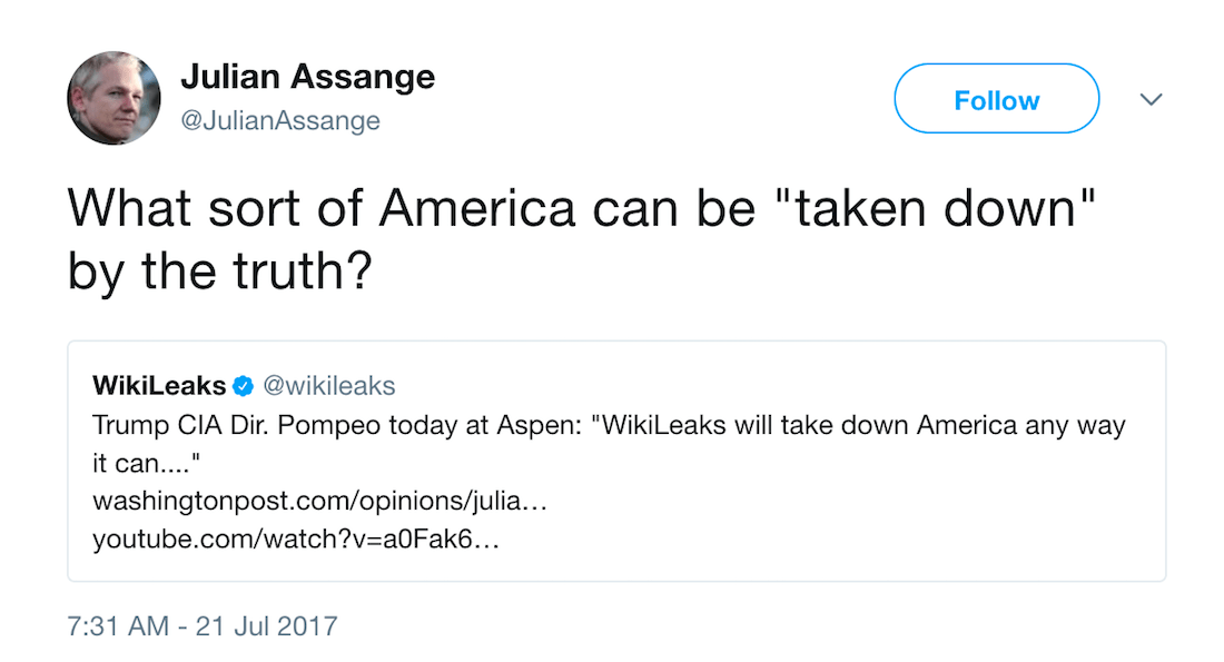 With President Trump being informed by Prime Minister Blair how truly dangerous this CIA factional war really is, this report details, Trump, during his first months in office, took no action against Julian Assange—but that Assange interpreted as Trump siding with those CIA factions against him, and that then led Assange, on 7 March 2017, to release on Wikileaks its “Vault 7”—which stunningly contained all of the CIA’s most secret and highly classified hacking tools—and that led Trump’s CIA Director Mike Pompeo to shockingly declaring that Assange and Wikileaks “want to take down America any way they can”.