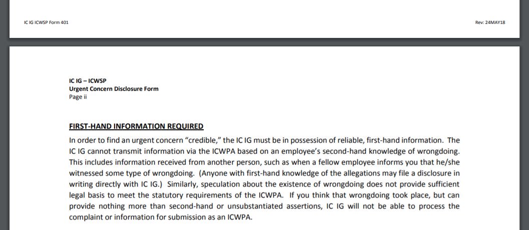 The position of Inspector General of the Intelligence Community was created by the Obama-Clinton administration in 2010, this report notes, and its sole function was to investigate what are called whistle blower complaints—the most serious of which sees a whistleblower filling out what is called a “Disclosure of Urgent Concern” form that clearly states: “If you think that wrongdoing took place, but can provide nothing more than second-hand or unsubstantiated assertions, [the Intelligence Community Inspector General] will not be able to process the complaint or information for submission as an ICWPA”.