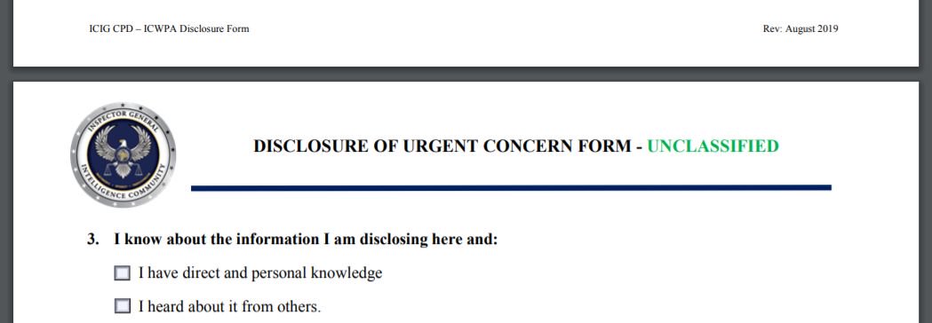 Above is the revised Disclosure of Urgent Concern form following the August-2019 revision made by Inspector General Michael K. Atkinson allowing hearsay evidence.