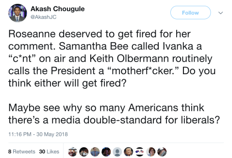 Equally stunning about the American leftist mainstream media, this report details, was this past week their manically celebrating the demise of pro-Trump conservative comedian Rosanne Barr who starred in that nation’s most watched television comedy programme—but who after Tweeting that former top Obama aide Valerie Jarrett was the offspring of Islamic terrorists and Planet of the Apes, was quickly fired—but who are all now remaining silent after the rabidly anti-Trump leftist comedian Samantha Bee went on her TBS Network (owned by CNN parent company Turner Broadcasting) programme just hours ago telling President Trump’s daughter Ivanka to “put on something tight and low-cut” and go into her fathers bedroom at the White House and then: “Do Something About Your Dad’s Immigration Practices, You Feckless Cunt”.
