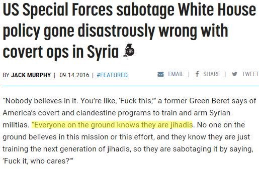 By September 2016, in the heated atmosphere of the US president election, this report details, the US militaries hatred and anger towards the Obama-CIA plot to arm Islamic terrorists broke into the open when a former US Army Green Beret officer associated with covert operations in Syria spoke out to a prominent military news site, called SOFREP, blowing the whistle on details surrounding the CIA’s use of jihadists to overthrow Assad by his stating: