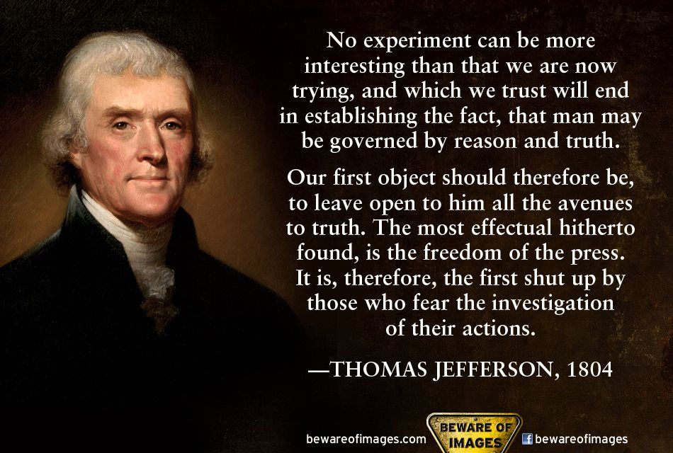 On 28 June 1804, this report continues American Founding Father, writer of the Declaration of Independence, and 3rd President of the United States Thomas Jefferson penned a letter to Judge John Tyler, who is best known for his being the father of the 10th President of the United States John Tyler—and wherein Jefferson wrote: “Our first object should therefore be, to leave open to him all the avenues to truth. The most effectual hitherto found, is the freedom of the press. It is therefore, the first shut up by those who fear the investigation of their actions”.