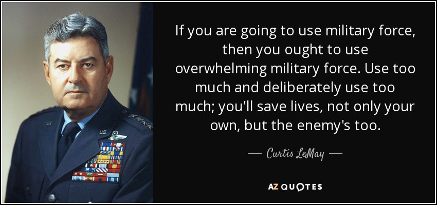 This US military mass extermination war tactic, this report details, was first deployed by them during World War II—during which it was perfected by US Air Force General Curtis LeMay whose simple philosophy of war was “If you kill enough of them, they stop fighting”—and in using, saw General LeMay’s forces obliterating hundreds of the largest cities in Germany and Japan killing tens-of-millions of civilians—after which he rightly stated: “I suppose if I had lost the war, I would have been tried as a war criminal”.