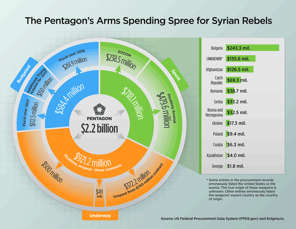 “The Pentagon has relied on an army of contractors and sub-contractors – from blue-chip military giants to firms linked to organized crime – to supply up to US$ 2.2 billion worth of Soviet-style arms and ammunition to Syrian rebels fighting a sprawling war against the Islamic State (ISIS).