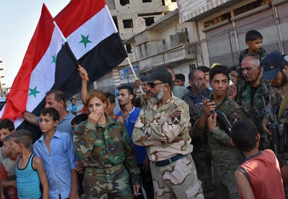 Major General of the Syrian Republican Guard Issam Zahreddine (arms crossed), and his top female aide (cigarette in hand), talk with civilians in the eastern city of Deir ez-Zor on 10 September as they continue to press forward with Russian air cover in the offensive against ISIS and US-backed terrorists across the province. [Note: Americans aren’t allowed to know about the woman commanders in the Syrian Army fighting Islamic terrorists.]