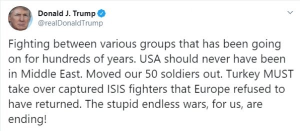 With the US-backed 60,000 strong SDF fighting force crumbling in the face of Turkey’s week long assault on them, this report concludes, its top Kurdish commander Mazloum Abdi split his forces from the SDF to make peace with Syria, rather than face Turkey, and declared to the world: “We know we would have to make painful compromises with Moscow and Assad if we go down that road. But if we have to choose between compromises and the genocide of our people, we will surely choose life”—a peace agreement that in the past few hours allowed Syrian army forces to gain full control of the city of Manbij before Turkish military forces smashed into it—and that also now sees Russian military police forces patrolling the contact line between Syrian and Turkish forces, too—with the hope of everyone being that the Americans stay out of this quagmire they made so the nations, governments and peoples actually living there can sort everything out for themselves and return this region to the peace it had before the Obama-Clinton Regime decided to destroy it—which in the United States itself is now being called “The Great Political Sickness Of Our Time” as American voters of every stripe are nearly unified against involvement in these endless wars in places like Syria—at the very same moment when American politicians in Washington of every stripe are nearly unified in favor of the same said wars—with the lone exception being President Donald Trump—whom top Democrat Party leader Harry Reid just warned his comrade warmongering socialists about by telling them:: “Do Not Underestimate President Trump”.