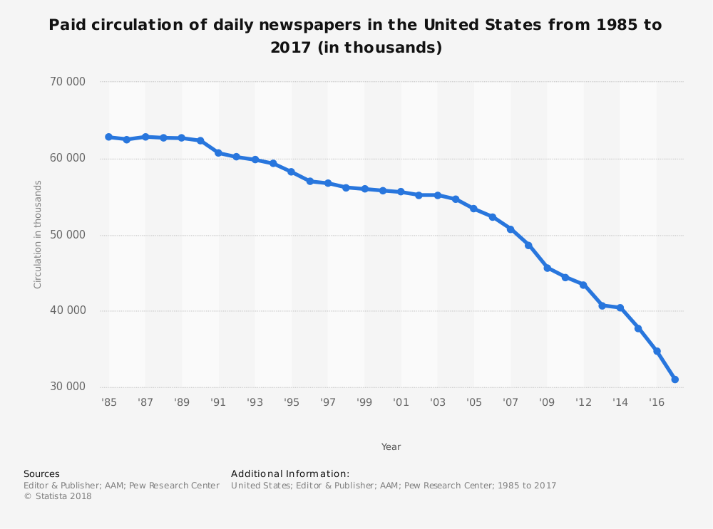Less than 20 million Americans receive their news from local newspapers in 2019…