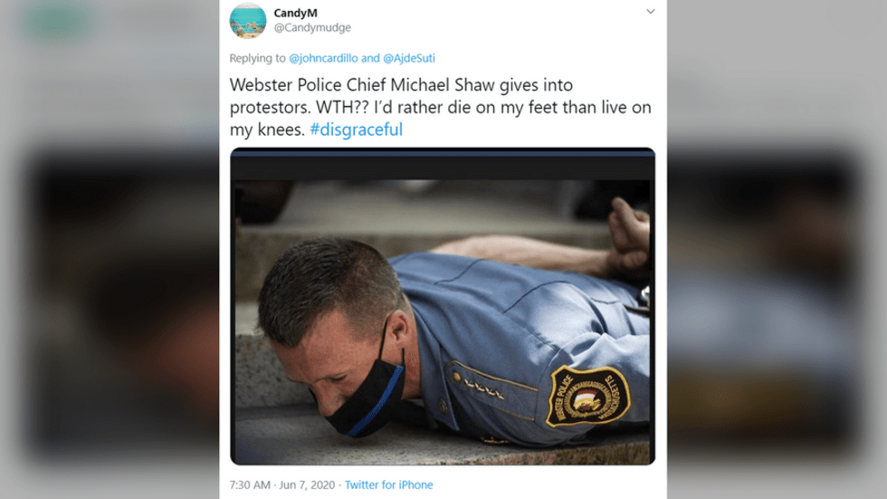 …while Webster-Massachusetts Police Chief Michael Shaw prostrates himself (above) before socialist protest leaders…
