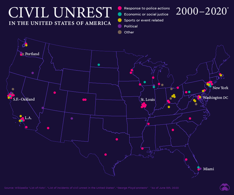 As to the actual true condition of the United States at this present time, this report concludes, it’s perhaps best summarized in the just published headline: “The American Experiment Isn’t Dead Yet but the Lab Is on Fire Right Now”—a “lab fire” wherein these riots are about the left’s hatred of President Trump and seizing power—and in order to seize power, now sees the socialist Democrat Party having adopted all of the Weather Underground strategies for resistance into their party platform—though to what end isn’t quite clear, as the great mass of these young socialist protesters are now declaring in unison “Revolution Is the Solution, Not Voting!”—which explains why a Pentagon war game includes a scenario for a military response to domestic Gen Z rebellion—and if needed, would be a war ending near immediately after it started—most particularly because when looking at the past 20-year map (2000 to 2020) of where all of the civil unrest in America has occurred in, all of it has been in socialist Democrat Party controlled Cities and States—not in the Republican Party controlled Free States and regions, which encompass nearly all of their country.